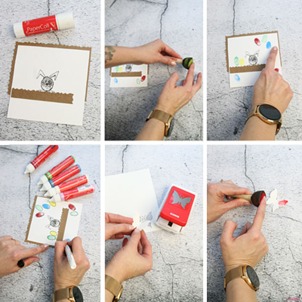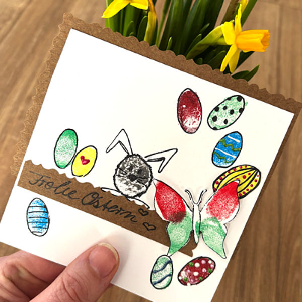 Süße Ostergrüße mit Patscholino! Mit unseren leuchtenden Patscholino Fingerfarben werden selbstgemachte Osterkarten zu kleinen Kunstwerken. Einfach Eier, Hase oder Schmetterling gestalten, tupfen, mischen und mit liebevollen Details verzieren, schon entsteht ein ganz persönlicher Ostergruß.
