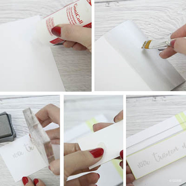 - Auf ein weiteres Stück Designkarton „Wir trauen uns“ mit InkPad Silber und den Kleinbuchstaben stempeln.