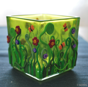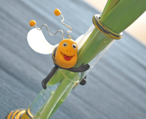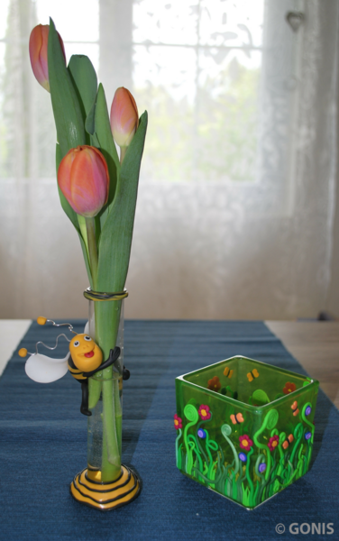 Zur Inspiration habe ich Euch eine kleine Tischdeko zusammengestellt. Ein Windlicht, dass ich mit einer Blumenwiese aufgehübscht habe und eine passende Vase dazu, auf der schon die Biene sitzt und sich freut, die Blumen zu besuchen. Das Windlicht kann man auch zweckentfremden und Zucker einfüllen und einen passenden Löffel dazu gestalten.