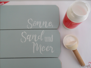 Mit der Flexschablone „Ahoi“ und OutdoorDecor Weiß den Spruch „Sonne, Sand und Meer“ auftupfen.