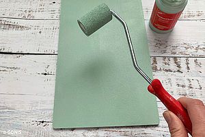 Das MDF-Schild mithilfe des Farbrollers mit der Farbe OutdoorDecor Seegrün grundieren und trocknen lassen.