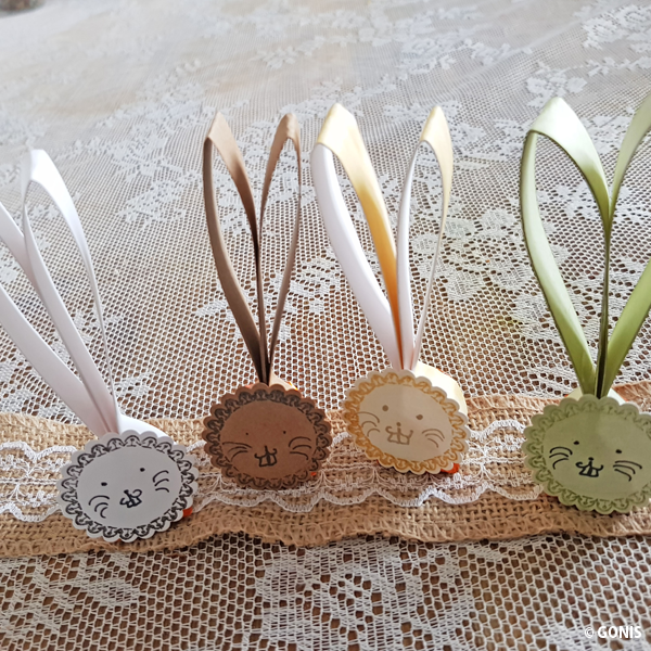 7. Motiv mit GONIS Stanzer „Rundes Etikett“ ausstanzen, Hasengesicht mit Fineliner Schwarz malen und Gesicht mit GoniColl-Klebepunkt aufkleben.