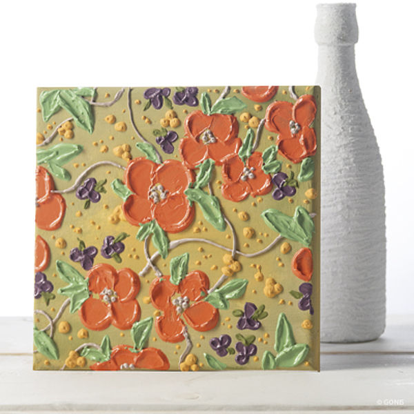 - Für das zarte Blütenbild eine Leinwand mit DecorCreme Goldgelb und Blattgrün einstreichen.