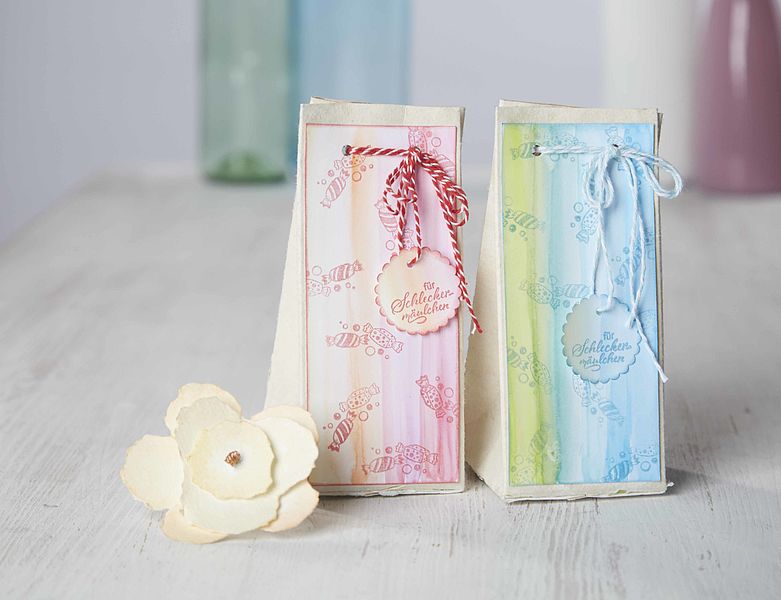 Entfernt als erstes die bedruckte Folie eines Getränkekartons und schneidet den Ausgießer ab. Malt mit dem Wassertankpinsel und Aqua-XXL einen schönen Farbverlauf auf Designkarton. Mit unserem Stempel „Mit Liebe gemacht“ und InkDecor könnt ihr danach die Bonbons aufstempeln. Nun schneidet ihr euch das Papier in die richtige Größe, färbt die Kanten mit InkDecor und klebt es auf den Getränkekarton. Mit unserem Stanzer „Rundes Etikett“ könnt ihr anschließend schöne Anhänger gestalten. Faltet den Getränkekarton in Form, locht diesen, fädelt ein schönes Band durch den Karton sowie den Anhänger und verschließt die Tüte.