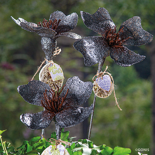 - Nun aus Papierdraht drei Dolden formen, um einen Holzstab wickeln und in den Flaschenhals stecken. Zum Fixieren reichlich Kreppband und ggf. RubbelColl verwenden.