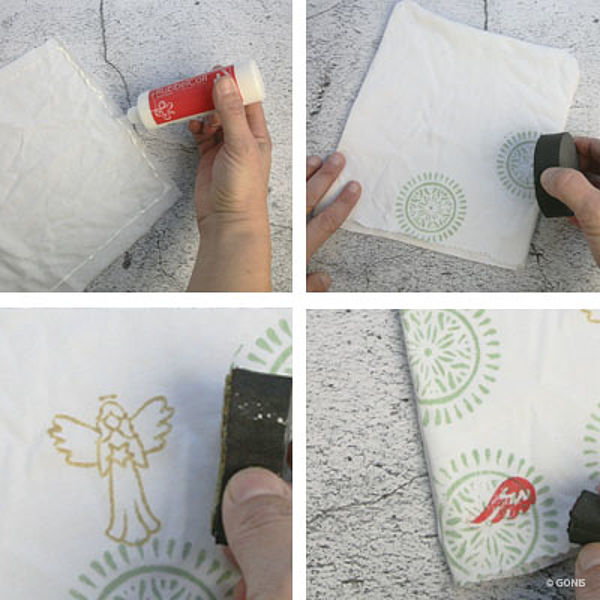 - Den Schriftzug der Selbstklebenden Schablone Schutzengel mit OutdoorDecor deluxe Antikgold auf das Kissen schablonieren.