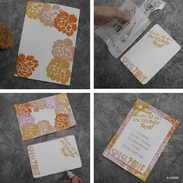 - Mit Flexschablone Feierlaune einen Schriftzug schablonieren und die Kante der Karte mit DecoPointer Kirschblüte umranden.