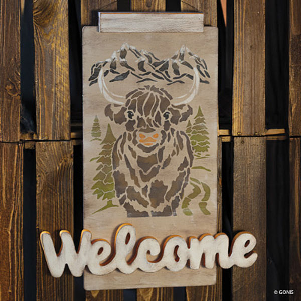 - Die Flexschablone Hochlandrind auf das getrocknete Schild legen und mit einem Tupfschwamm und OutdoorDecor Zartbitter, Kürbis, Weiß, Olive und Schwarz schablonieren.