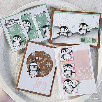 - 3 Pinguine mit InkPad Schwarz stempeln. Mit InkPad und dem Wassertankpinsel kolorieren. Anschließend ausschneiden.