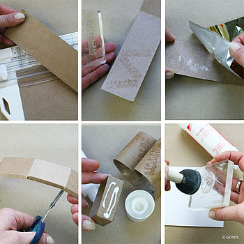 6. Tamponner avec GoniColl "Schön das es dich gibt" (Quelle chance que tu existes !). Après séchage, dorer avec la GlanzFolie et fixer avec un ruban déco et RubellColl à la petite boîte-cœur.