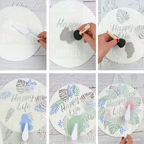 - Tamponner l’une après l’autre deux feuilles et deux palmes du pochoir flexible, en cercle autour de l’écriture avec OutdoorDecor taupe.