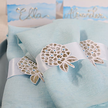 Che sia per Pasqua, una festa di famiglia o una cena domenicale - una tavola con delle belle decorazioni rende il cibo ancora più gustoso. Questo è facilissimo con gli anelli portatovaglioli di nostra produzione. La tavola appare particolarmente bella e fresca con molto bianco, oro e blu delicato.