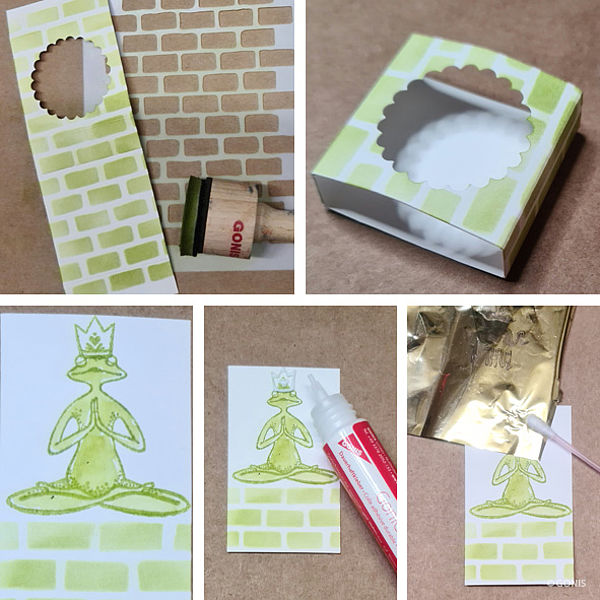 5. Lascia ad asciugare la colla e dora con GlanzFolie. Ritaglia la rana sul muro e attaccala alla scatolina di cioccolato da dietro con RubbelColl.