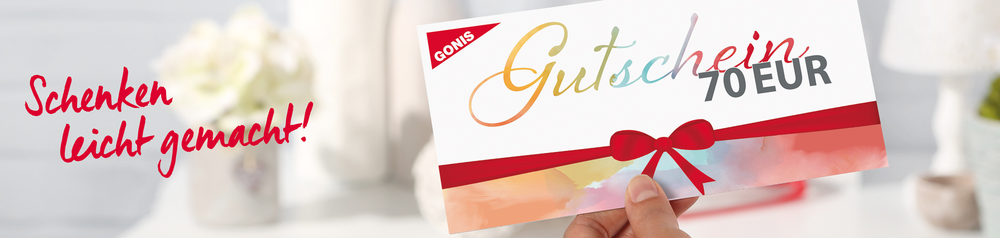 Wenn in letzter Minute mal wieder ein Geschenk fehlt oder man nicht weiß, was man schenken soll, dann bietet sich der Kauf eines Gutscheins an. Vor jedem Geburtstag, jedem Weihnachten und jedem Jahrestag sitzen wir wieder vor derselben Frage: Wie sieht es aus, das perfekte Geschenk? Ein Geschenkgutschein von GONIS ist die Antwort. Sie möchten eine kleine Aufmerksamkeit als Dankeschön vergeben? Oder darf es für die dekobegeisterte Freundin gerne etwas mehr sein? Wählen Sie aus den drei Gutscheinen – 20 bis 70 Euro bzw. 30 bis 90 CHF.